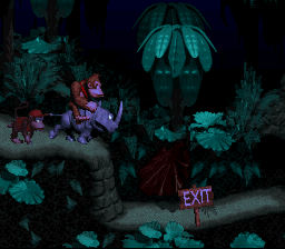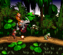 After making the steel keg vanish, have Diddy carry the 'thin air' all the way to the Klump at the end of the level. If all goes well, the Klump's range of movement should be quite restricted (he will be pacing back and forth pretty much in one spot). Stand to the left of him, as close to him as you can, and face left. The timing here's real tricky- you have to throw the thin air (release 'Y') when the Klump is facing Diddy (both the Klump and Diddy should be facing left), then immediately hold left and tap 'Y' to perform a cartwheel.