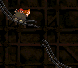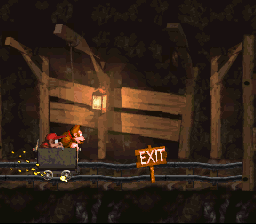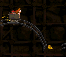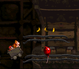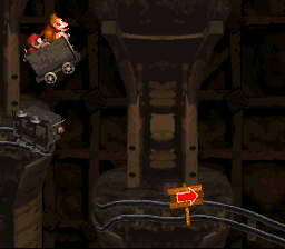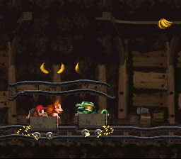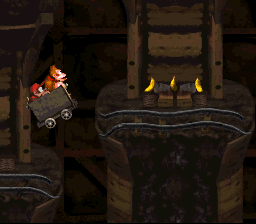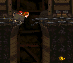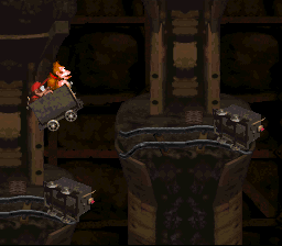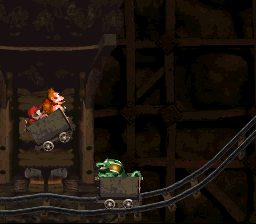 In this level, DK and Diddy lift the cart with them when they jump. This is a good thing, as there are no replacement carts available if theirs should fall!