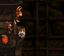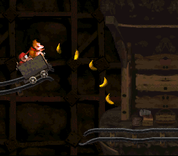 To give DK and Diddy the power to roll-jump repeatedly in midair, just break Mine Cart Carnage's midpoint barrel, then leave the level (either by using Start/Select, or by losing a life). At the map screen, press and hold 'B' to reenter the level. Keep holding 'B' until the lead Kong breaks out of the midpoint barrel and leaps into the air. Now just avoid landing in the waiting mine cart, and press 'Y' then 'B' repeatedly in alternation.