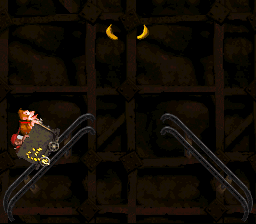 For reasons unknown, there is a bunch of bananas positioned below the tracks, which is unable to been seen or collected during normal play. This mystery bunch is located beneath cart rails, between the first set of two bananas and the first set of three bananas.