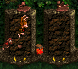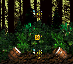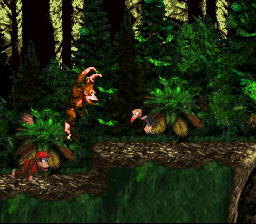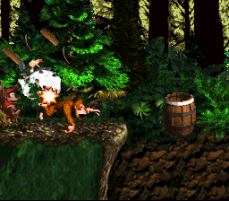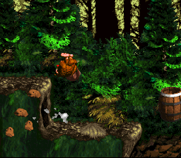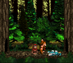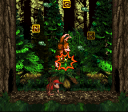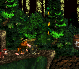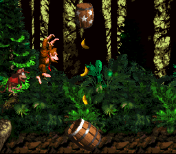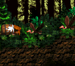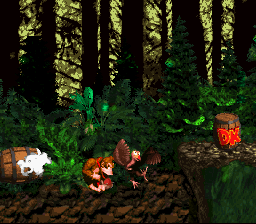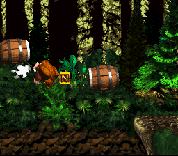 Their first time in the forest sees the Kongs negotiating a woodland path inhabited by dozens of Neckys. There are many deep and wide gaps between the platforms of this area, so barrel cannons are often required, and even the Neckys unwittingly assist the Kongs in continuing their journey.
