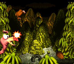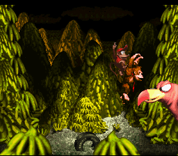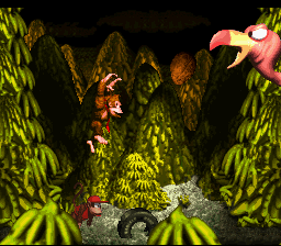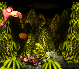 Once he spits a nut, DK or Diddy need to hit Master Necky with a jump attack. It's often tricky to jump on him from the ground, so it's fortunate that a tire is located in the middle of the arena for the Kongs to bounce on. After five blows to the beak, this big, bad buzzard bites the dust.