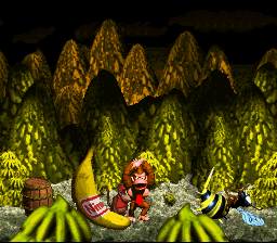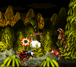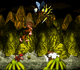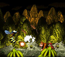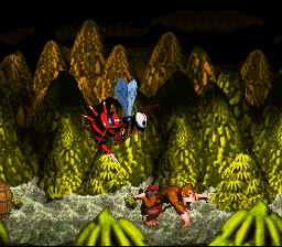 When hit, Queen B. will turn red and zigzag up and down in pursuit of the Kongs; she is immune to all attacks during this phase, so wait until she stops flashing red before letting another barrel fly.