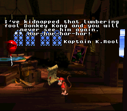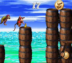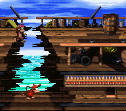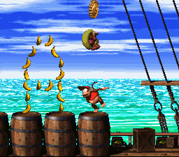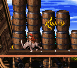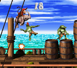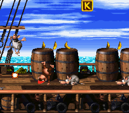 After finding a kidnapping note (and a mocking gift) in Kaptain K. Rool's cabin,Diddy and Dixie encounter more than a dozen Neeks aboard this stretch of ship deck. Rambi helps knock these rodents overboard, and easily bowls over the surprisingly light contingent of the Kremling Krew.