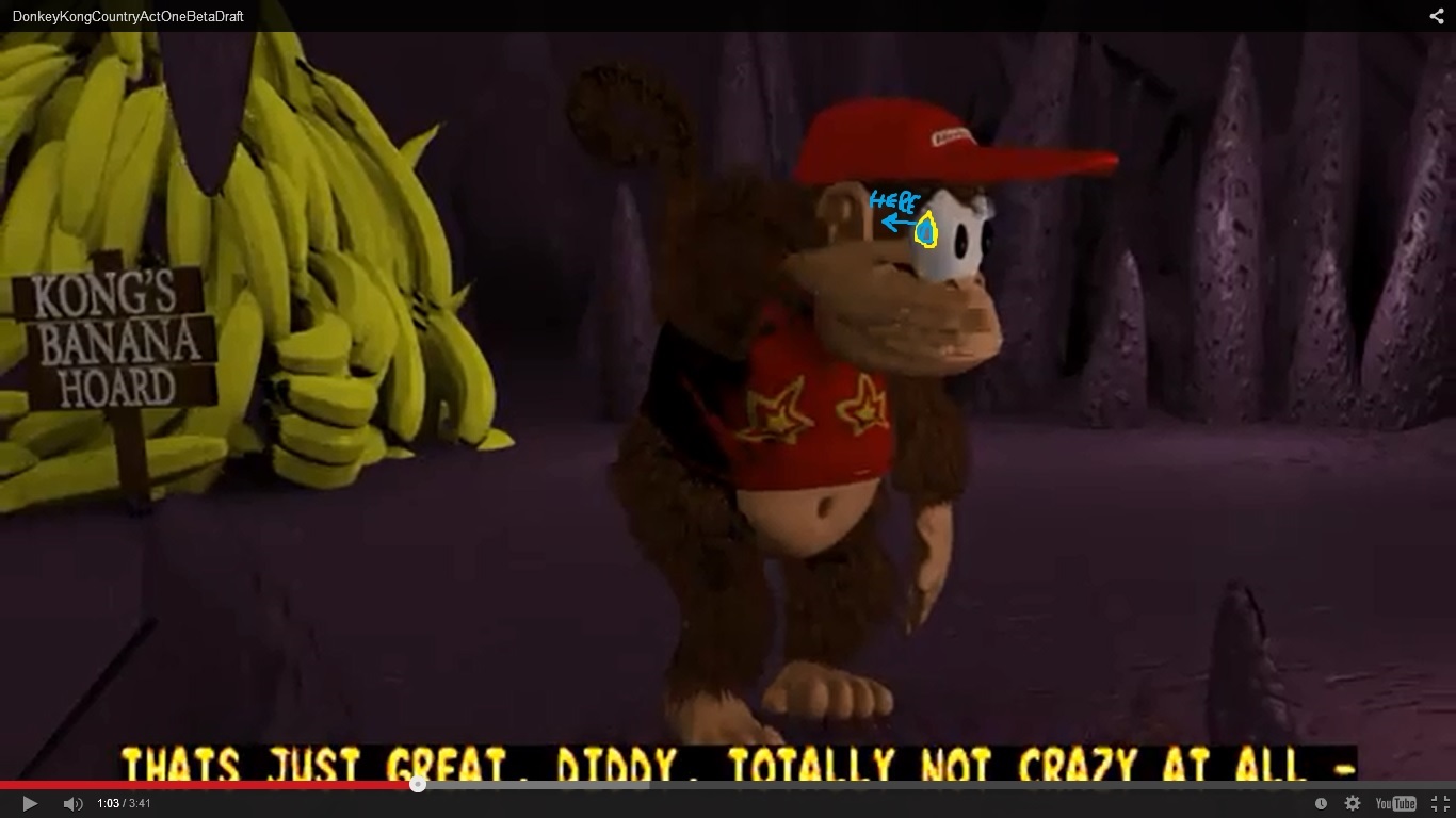 I would suggest that, when Diddy gets freaked out by the lightning, that it happens AFTER he is finished talking, because then it looks slightly off and silly. The drops should also be present only during the scene with the kremlings(they just look very stupid before that scene appears at all in my opinion), which should start out with Diddy facing the exit to the cave and noticing one of the shadows, before turning around and noticing the others, or with him seeing the gnawty come running into the cave(you know, thatgnawty in the scene right before Diddy's) and as he either turns around to look at it go by or trys to get rid of it before it takes the bananas, notices the kremling shadows, and the scene plays as normal.